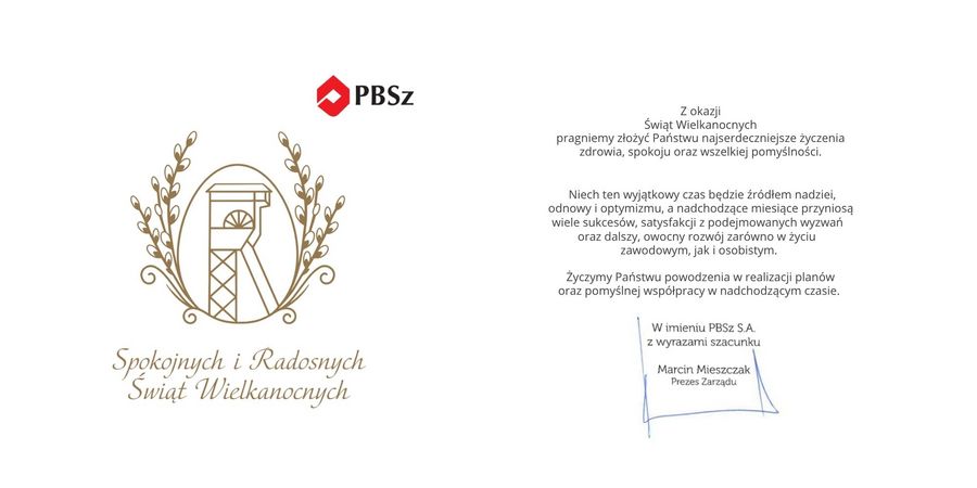 Wielkanocne życzenia od Zarządu 02.04.2026 Spokojnych i Radosnych Świąt Wielkanocnych życzy Zarząd PBSz S.A.
